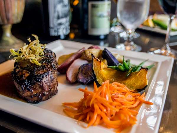 Steaks are topped with a bit of house demi-glace and crispy fried leeks. Served with rosemary garlic fingerling potatoes & mixed vegetables. GF